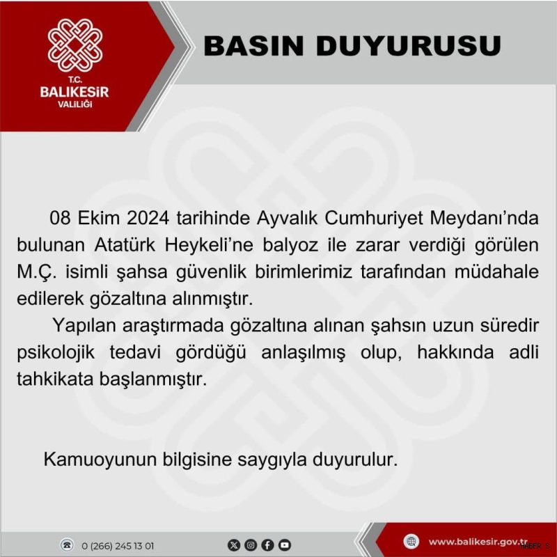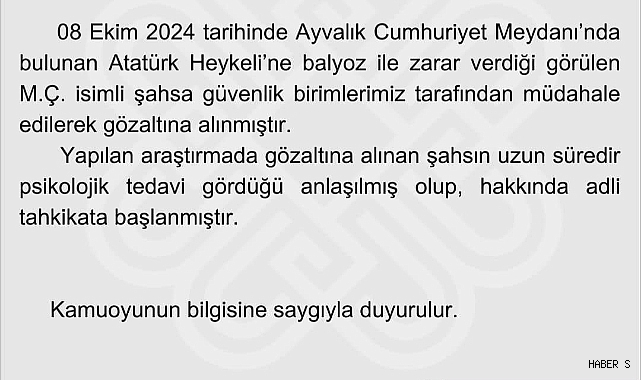 Balıkesir'in Ayvalık ilçesinde Cumhuriyet Meydanı'nda bulunan Atatürk heykeline balyozla zarar veren M.Ç. isimli şahıs, güvenlik birimlerinin hızlı müdahalesi sonucu gözaltına alındı.
