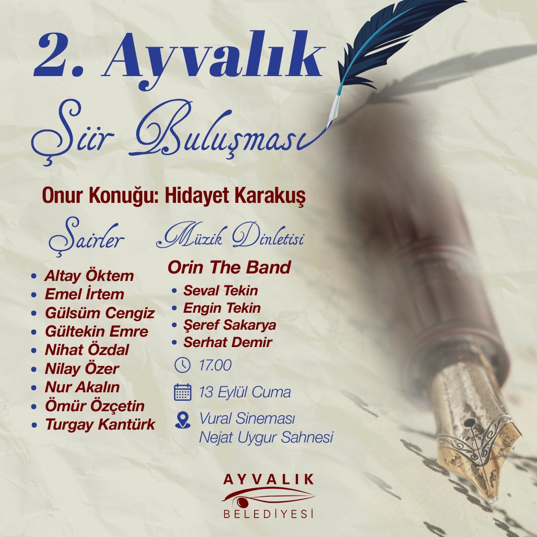 Ayvalık Belediyesi’nin desteğiyle düzenlenen bu buluşmada, edebiyatseverler şiirin zengin dünyasına adım atarken, katılımcılara imzalı şiir kitapları hediye edilecek. Onur konuğu olarak Hidayet Karakuş’un katılacağı etkinlikte, Altay Öktem, Emel İrtem, Gülsüm Cengiz, Nihat Özdal, Nilay Özer, Nur Akalın, Ömür Özçetin ve Turgay Kantürk gibi şairler de yer alacak.