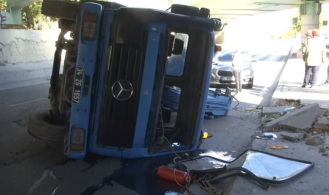İstanbul Bakırköy'de birçok kazanın yaşandığı üst geçide bu kez İSKİ'ye ait vinç çarpıp devrildi. Kazada ölen ya da yaralanan olmadı.