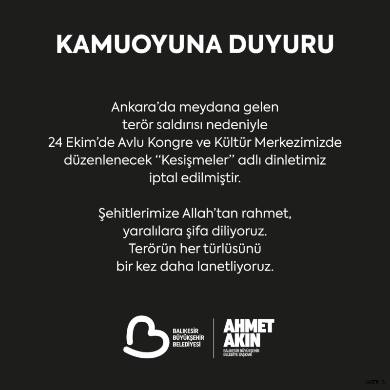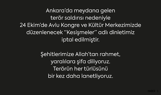 Balıkesir Büyükşehir Belediyesi, Ankara’da meydana gelen terör saldırısının ardından 24 Ekim’de Avlu Kongre ve Kültür Merkezi’nde düzenlenmesi planlanan “Kesişmeler” adlı dinletinin iptal edildiğini duyurdu. Belediyeden yapılan açıklamada, teröre karşı net bir tavır alınarak birlik ve dayanışma mesajı verildi.
