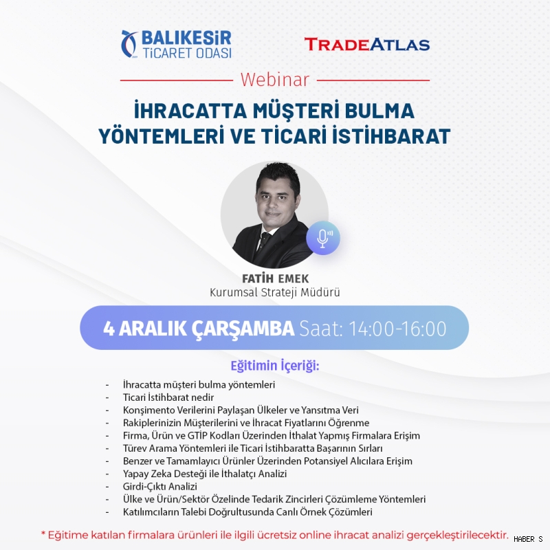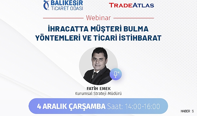 4 Aralık Çarşamba günü saat 14:00'te gerçekleşecek olan webinar, katılımcılara ihracatta yeni pazarlar keşfetme, doğru müşterilere ulaşma yöntemlerini öğrenme ve ticari istihbaratın gücünü keşfetme imkanı sağlayacak. Etkinlikte, uzmanlar tarafından ihracat stratejileri, müşteri bulma teknikleri ve ticari istihbaratın şirketler için nasıl bir avantaj sağladığına dair derinlemesine bilgiler paylaşılacak.