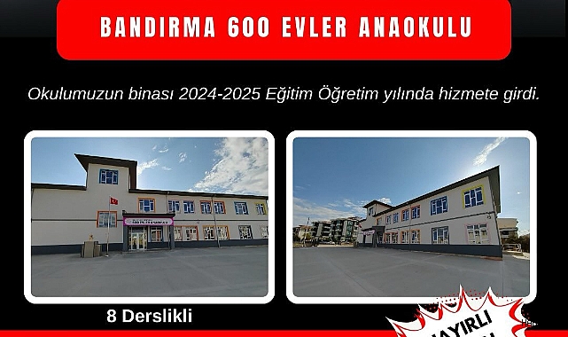 Balıkesir'in Bandırma ilçesinde Eğitim altyapısını güçlendirme çalışmaları hız kesmeden devam ediyor. Bu kapsamda, 600 Evler Anaokulu'nun yeni 8 derslikli binası, 2024-2025 eğitim öğretim yılı ile birlikte hizmete girdi.