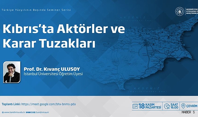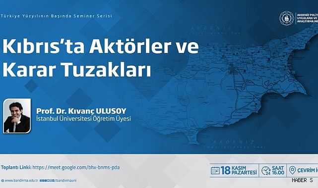 Bandırma Onyedi Eylül Üniversitesi, "Türkiye Yüzyılının Başında" seminer serisi kapsamında önemli bir etkinliğe imza atıyor. Üniversitenin Akdeniz Politikaları Uygulama ve Araştırma Merkezi tarafından organize edilen konferans, “Kıbrıs’ta Aktörler ve Karar Tuzakları” başlığını taşıyor. Bu konferans, güncel Kıbrıs politikaları ve uluslararası ilişkiler üzerine derinlemesine bir analiz yapmayı amaçlıyor.