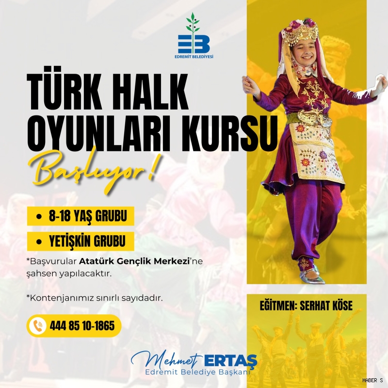 Edremit’in kültürel zenginliklerine katkı sunmayı amaçlayan halk oyunları kursları, deneyimli eğitmenler tarafından verilecek. Kurs kayıtları yüz yüze olarak Atatürk Gençlik Merkezi’nde yapılmakta olup, ilgilenen vatandaşlar kursa kayıt yaptırmak için merkeze bizzat başvurabilecekler.
