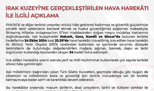 Milli Savunma Bakanlığından yapılan açıklamada, "PKK/KCK ve diğer terörist unsurları etkisiz hale getirerek halkımıza ve güvenlik güçlerimize yönelik terör saldırılarını bertaraf etmek ve hudut güvenliğimizi sağlamak maksadıyla; Birleşmiş Milletler Anlaşması'nın 51'inci maddesinden doğan meşru müdafaa haklarımız doğrultusunda, Irak kuzeyindeki Hakurk, Gara, Kandil ve Sincar'da bulunan terörist hedeflerine 24 Ekim 2024 saat 23.30'da hava harekatı icra edilmiş, icra edilen hava harekatı ile Bölücü Terör Örgütü (BTÖ) tarafından kullanılan ve içerisinde sorumlu düzeyde teröristlerin de bulunduğu değerlendirilen mağara, sığınak, barınak, depo ve terör örgütünün kullandığı tesislerden oluşan 34 hedef imha edilmiştir" ifadelerine yer verildi. Terörle mücadelede kararlılık vurgusu yapılan açıklamada, "İcra edilen harekatta azami oranda yerli ve milli mühimmat kullanılarak çok sayıda terörist etkisiz hale getirilmiştir. Asil milletimizin bağrından çıkan Türk Silahlı Kuvvetleri, geçmişte olduğu gibi bugün de ülkemizin ve milletimizin beka ve güvenliği için terörle mücadeleye tek bir terörist kalmayıncaya kadar azim ve kararlılıkla devam edecektir. Bu harekatlar sırasında; masum sivillerin, dost unsurların, tarihî ve kültürel varlıklar ile çevrenin zarar görmemesi için her türlü tedbir alınmıştır" denildi.