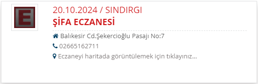 Sındırgı'da 20 Ekim Pazar günü nöbetçi eczanelerin listesi şu şekilde;