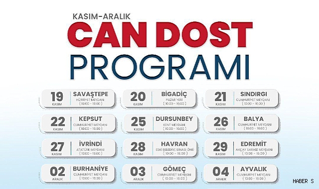 Kasım ayı programına Savaştepe Hürriyet Meydanı’nda başlayan "Can Dost", 20 Kasım Çarşamba günü Bigadiç Pazar Yeri’nde, 21 Kasım Perşembe günü ise Sındırgı Cumhuriyet Meydanı’nda olacak. Diğer duraklar arasında Kepsut, Dursunbey, Balya ve İvrindi gibi ilçeler yer alıyor.