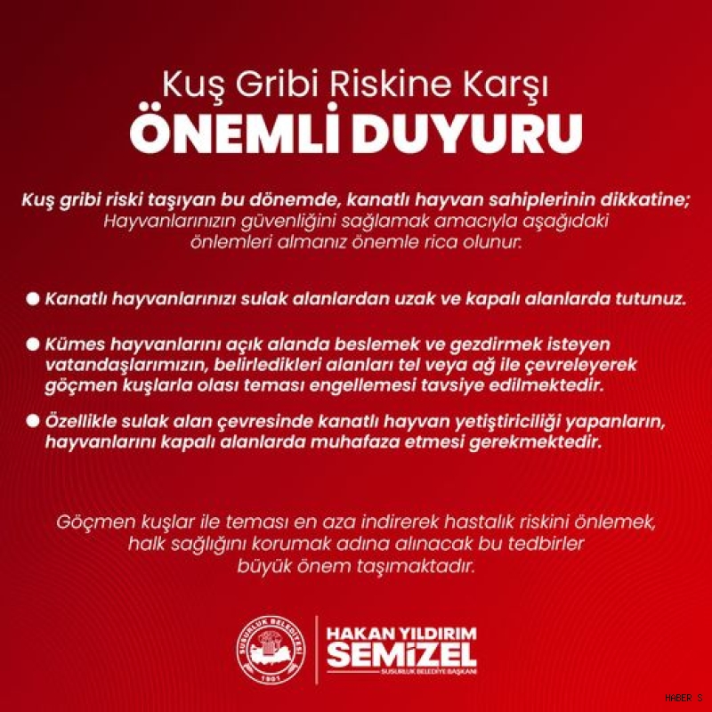 Susurluk Belediyesi, kanatlı hayvan sahiplerinin göçmen kuşlarla temasın önlenmesi adına alacağı tedbirlerin halk sağlığını korumada büyük bir rol oynayacağına dikkat çekti. Belediyeden yapılan açıklamada, hayvan sahiplerinin daha fazla dikkat etmeleri gerektiği ve bu dönemde