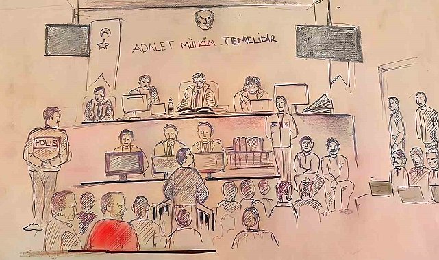 Duruşma salonu adliye ressamı Cengiz Karslıoğlu'nun çizimine yansıdı. Öte yandan, Fırat Sarı'nın yüz ifadesi de çizimlerde yer buldu.